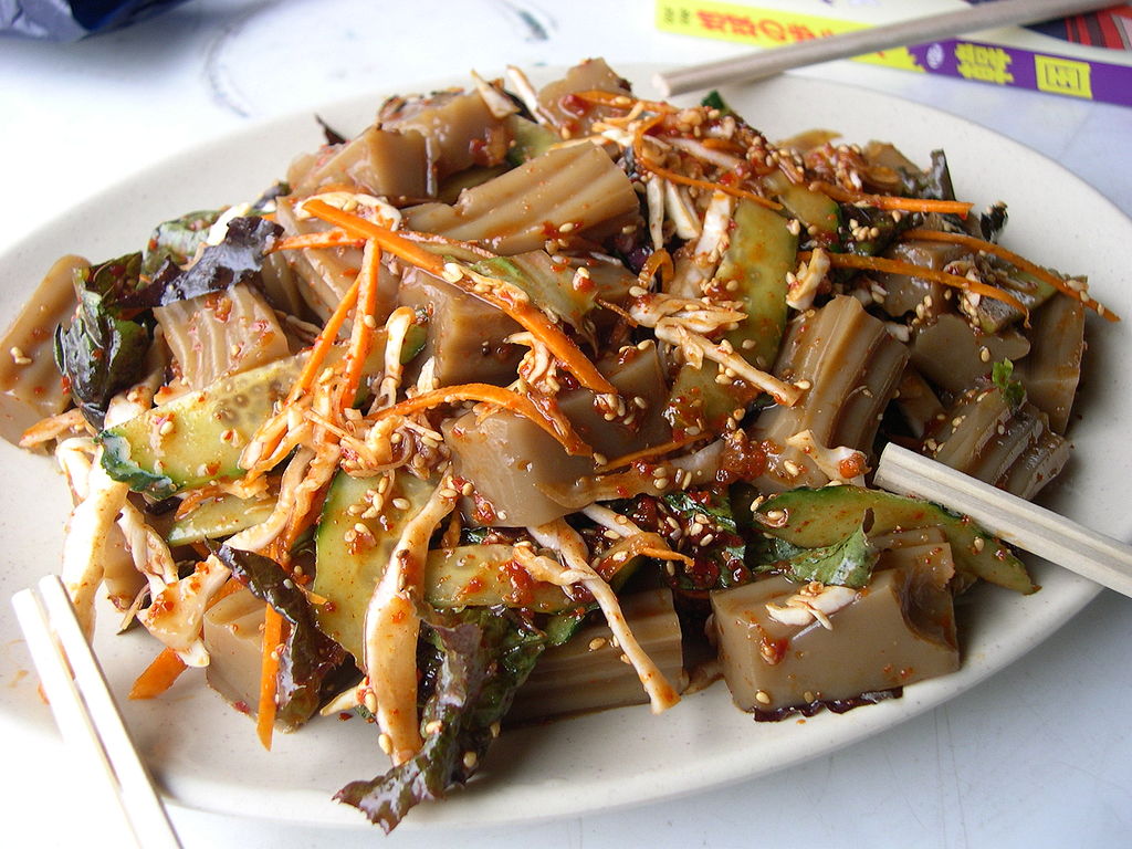보들보들한 식감의 도토리묵은 도토리의 녹말을 이용하여 만든 묵류의 음식입니다. 식량이 많지 않았던 한국전쟁 때 많이 먹었으며 서구권에서는 도토리로 묵을 해 먹는 것을 생소하게 본다고 합니다.